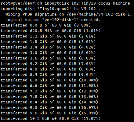 使用 qm importdisk 命令导入到新建的虚拟机qm importdisk [虚拟机id] [qcow2文件名称] [lvm存储名称]